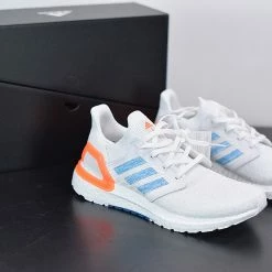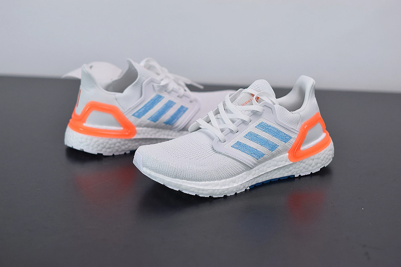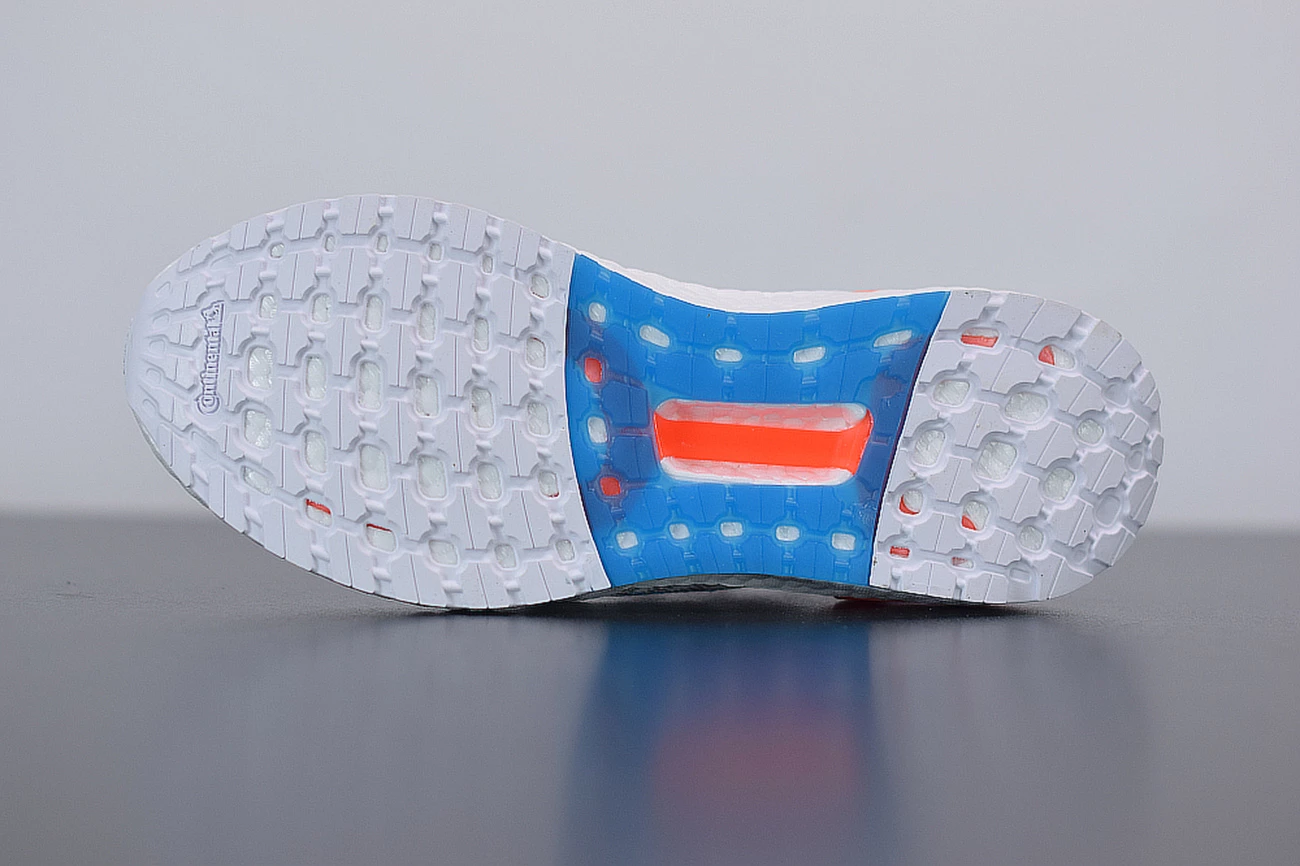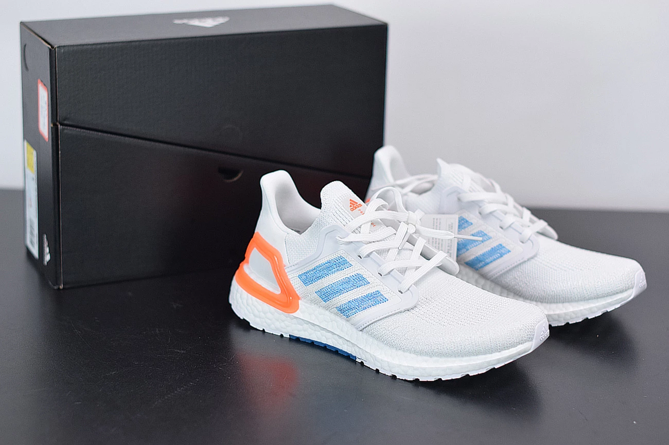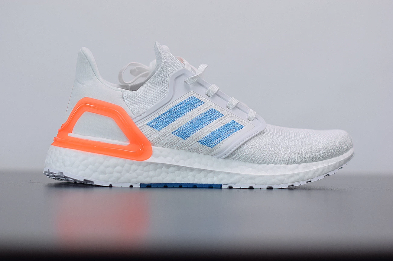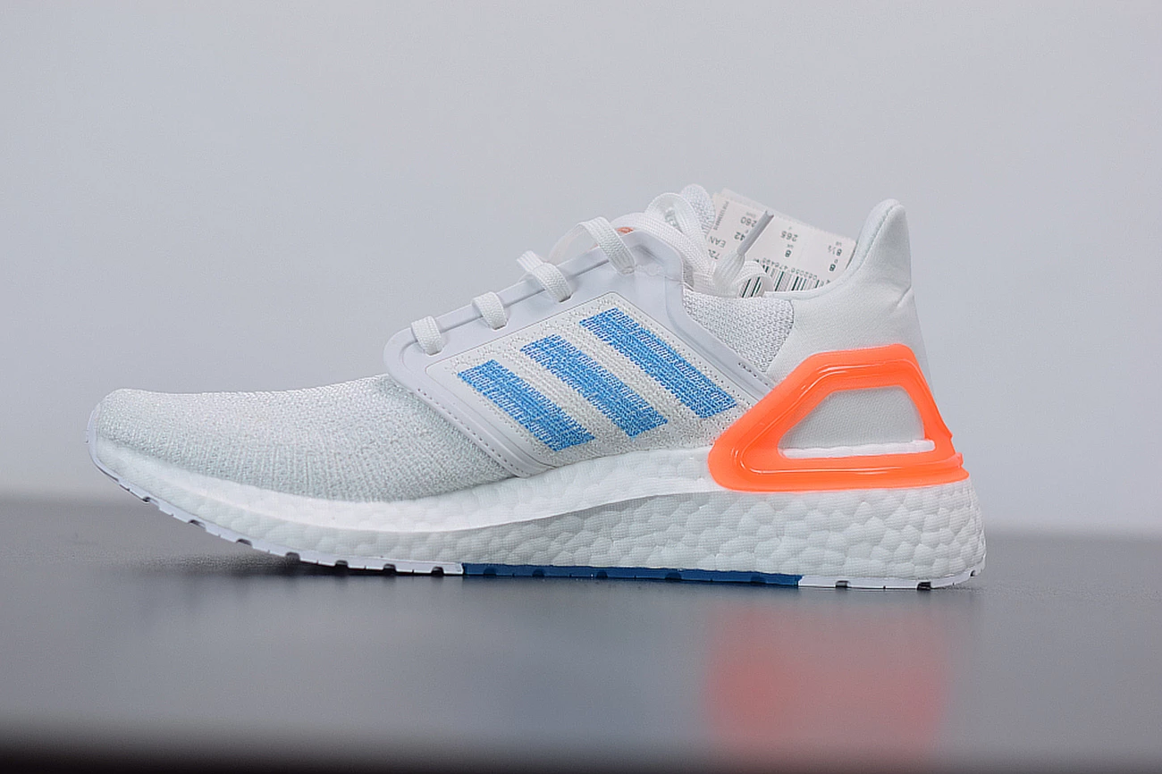 Down below, a signature white BOOST footbed provides the ultra-comfortable cushioning that’s become synonymous with the line over the past five years. There’s even more here for BOOST lovers as well: the UltraBOOST 20 adds 20 percent more BOOST material than previous models like the UltraBOOST 19 or UltraBOOST 4.0. White Continental rubber outsoles with dashes of orange and blue in the midfoot complete the look.