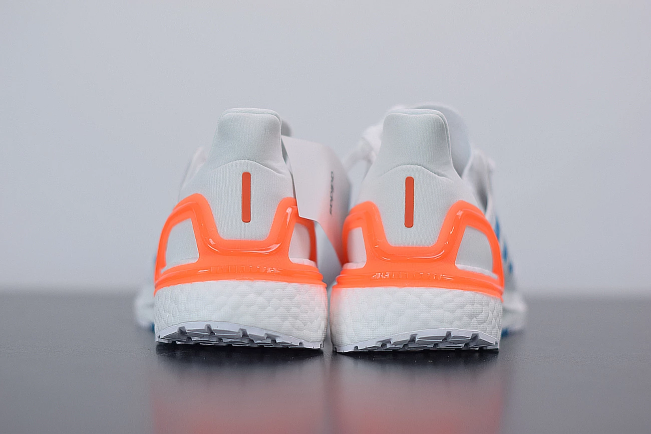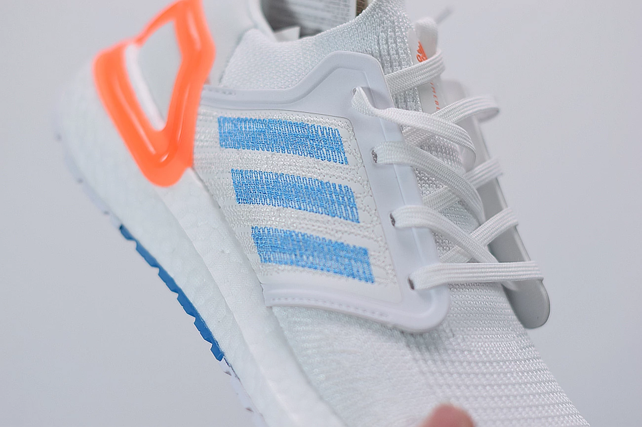 Though the material used on this new PRIMEBLUE UltraBOOST may differ slightly from previous models, no performance is sacrificed in the hunt for sustainability. White Primeknit uppers feature Tailored Fiber Placement technology for an adaptive, responsive fit, while midfoot cages and heel clips add support and structure. These pieces also handle a lion’s share of the detailing: the cage adds a rough-hewn blue Three Stripe graphic, and the clip takes on a vibrant orange hue. Tongues add a little detail to the mix as well by way of an orange PRIMEBLUE hit.