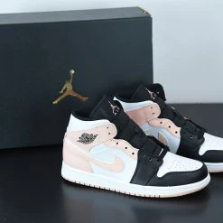 This edition of the mid-top Air Jordan 1 features a White leather base with Black leather overlays on the toe area to give off the OG “Black Toe” vibe. Black continues on the laces, tongue and lining highlighted with Crimson Tint on the upper lace stay, ankle collar, Swooshes, heels, Jumpman tongue logo and rubber outsole.