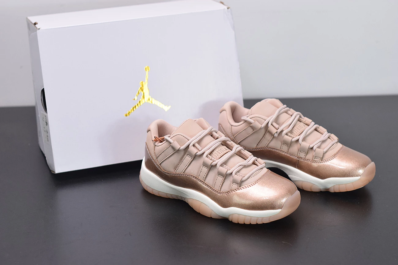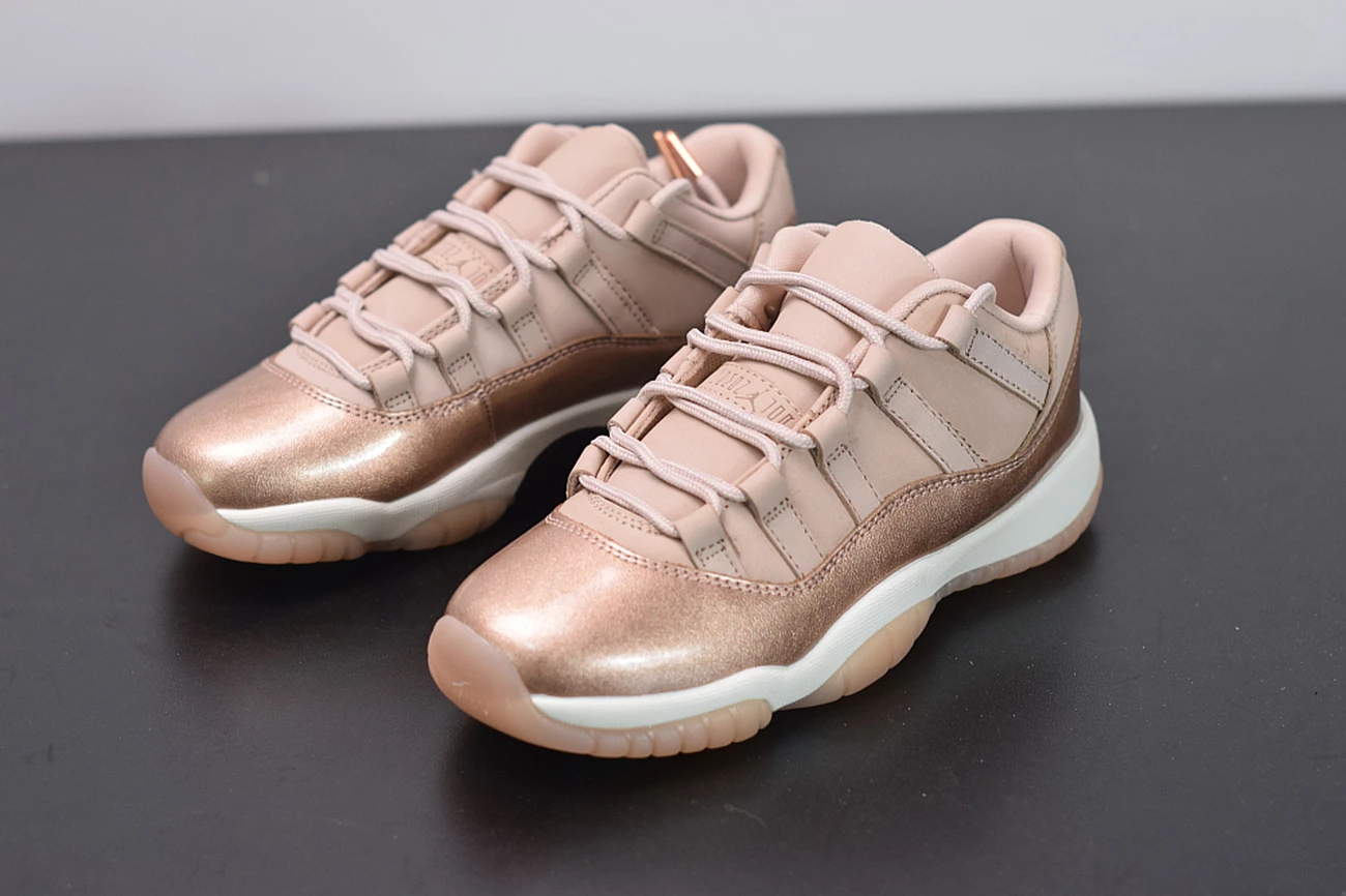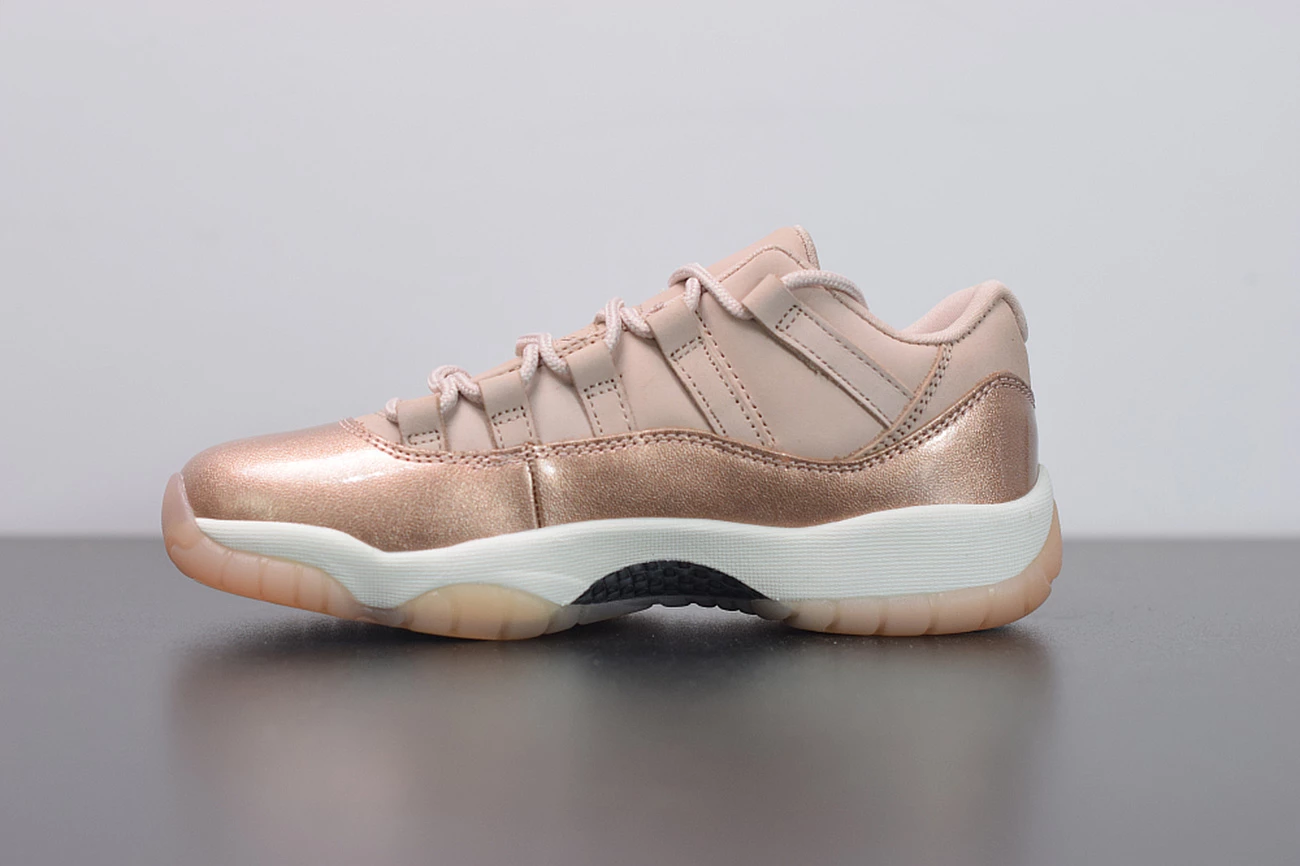 Dressed in Rose Gold-like color scheme. This low-top Air Jordan 11 ditches the usual mesh upper with a new constructed build. Highlighted with its Metallic Red Bronze patent overlay, atop a White midsole and Pink-tinted translucent