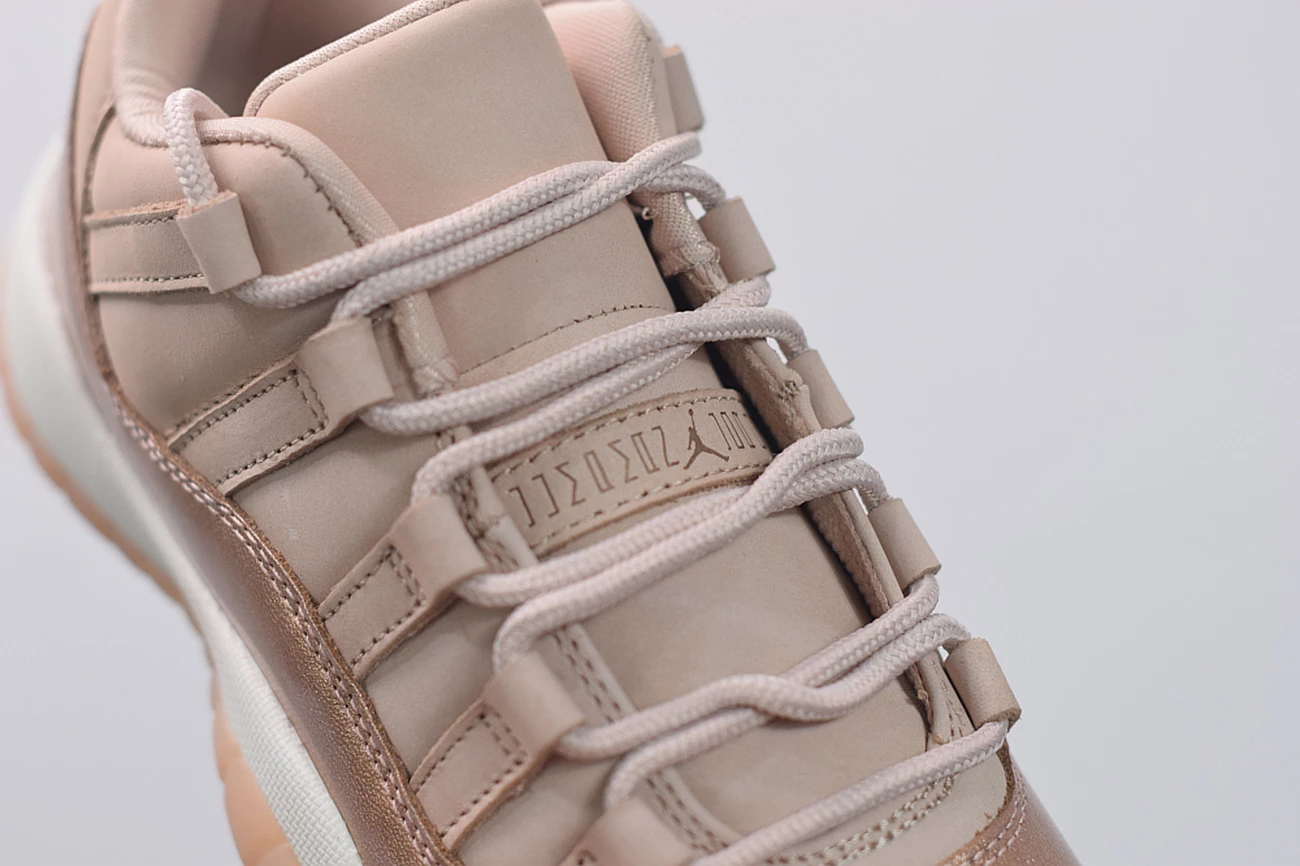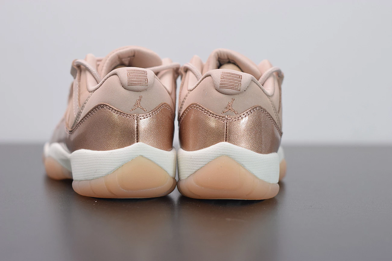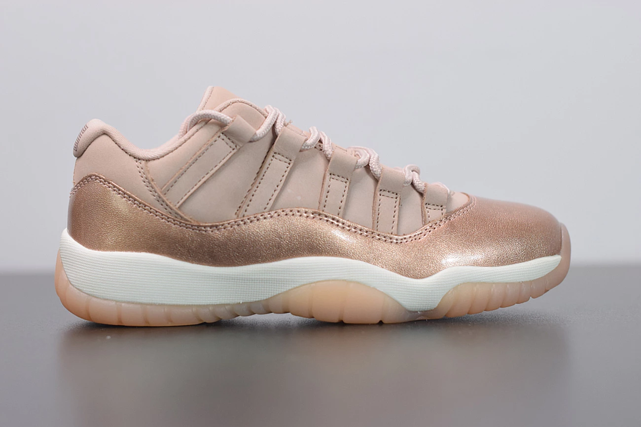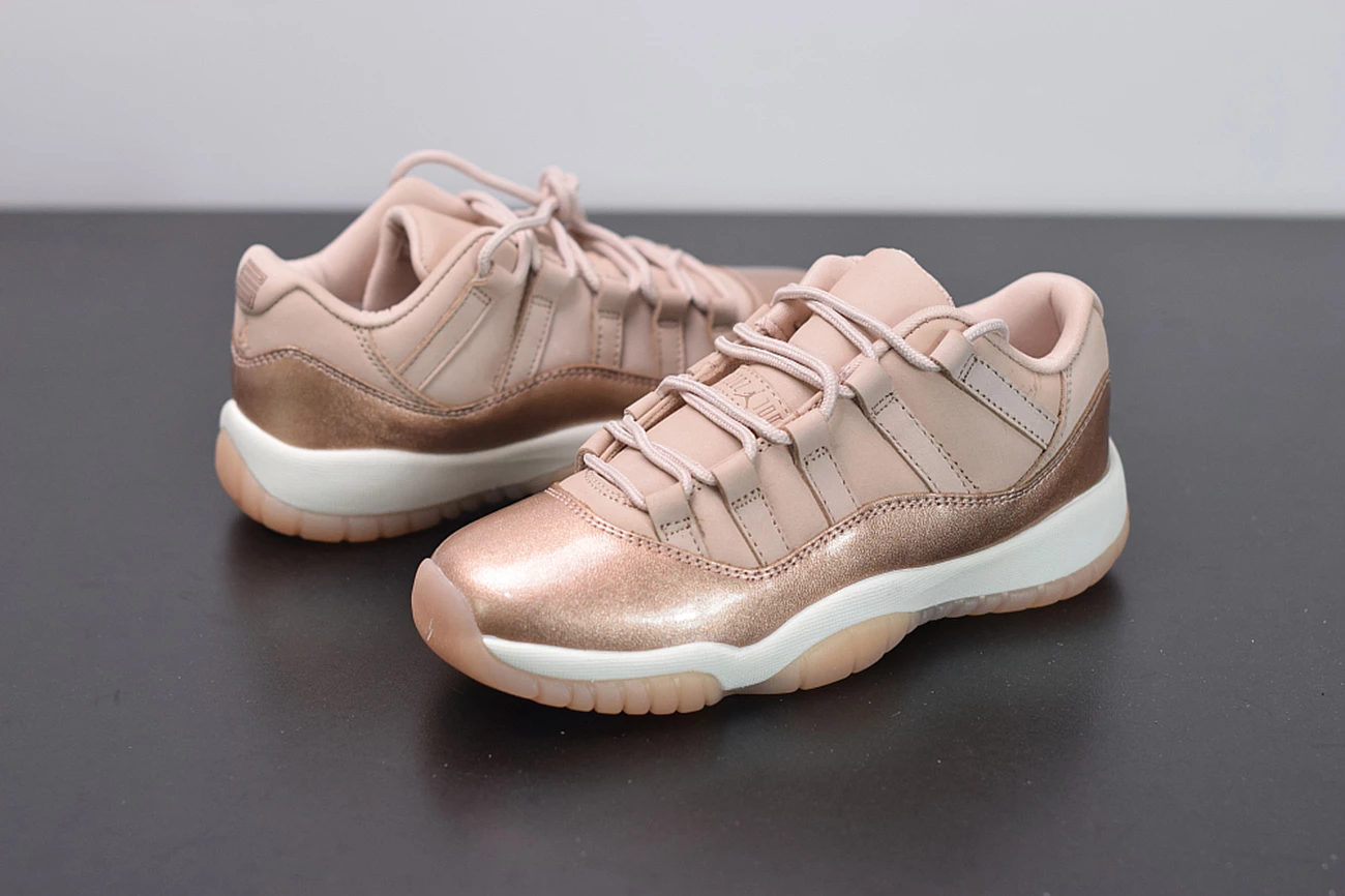 Dressed in Rose Gold-like color scheme. This low-top Air Jordan 11 ditches the usual mesh upper with a new constructed build. Highlighted with its Metallic Red Bronze patent overlay, atop a White midsole and Pink-tinted translucent