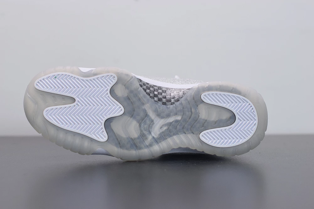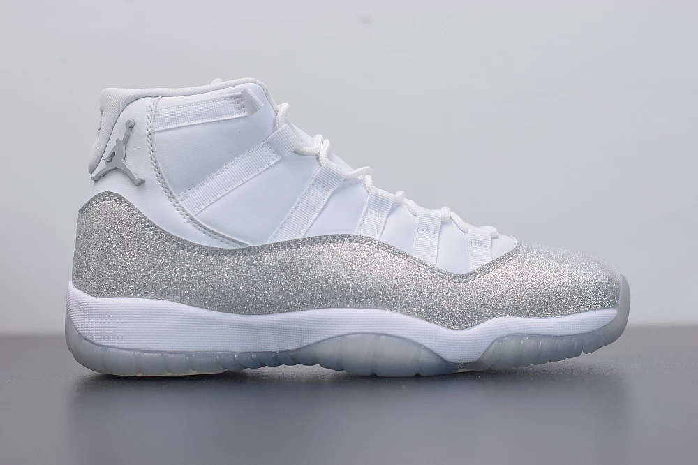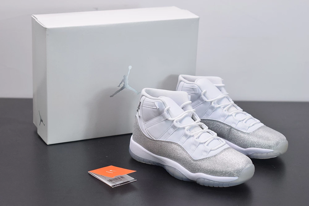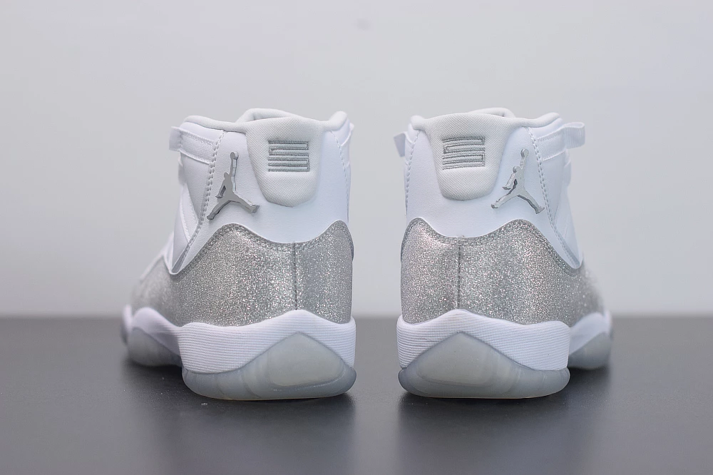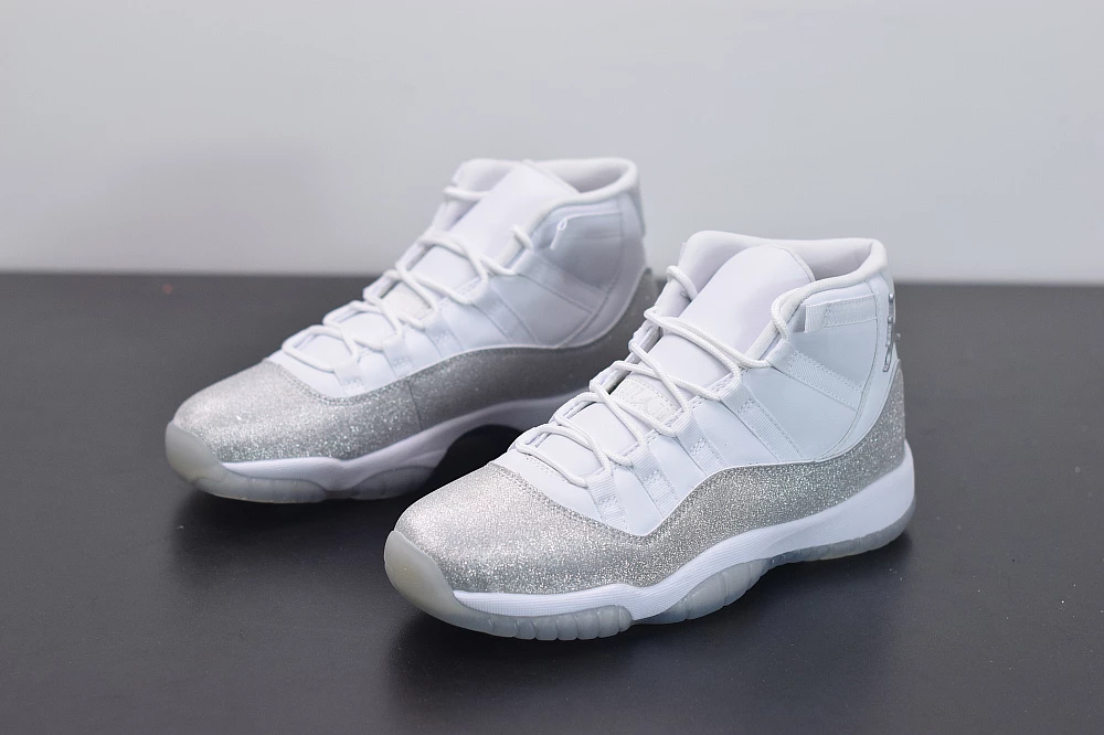 Dressed in a White, Metallic Silver, and Vast Grey color scheme. This Air Jordan 11 features a White upper with a shiny Silver-encrusted finish replacing the traditional glossy patent overlay adding for a nice luxurious touch. A White midsole atop a translucent outsole completes the design.