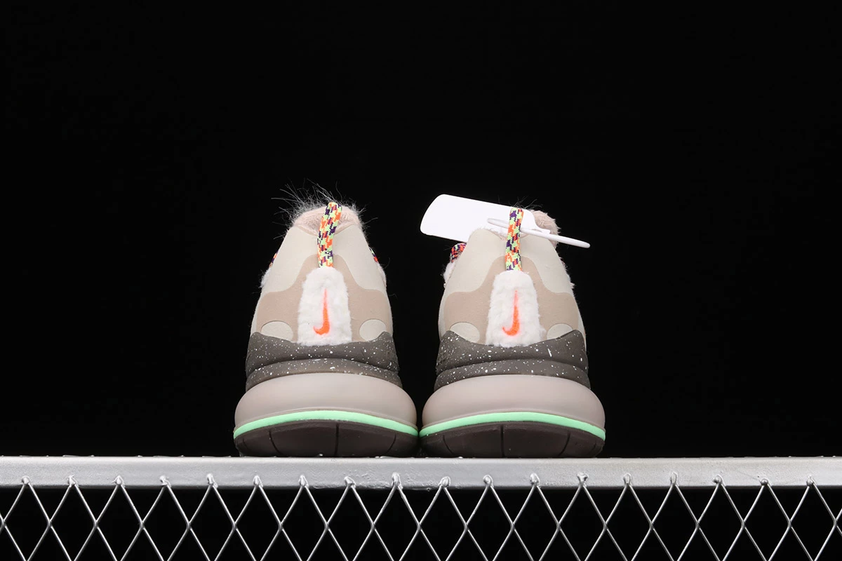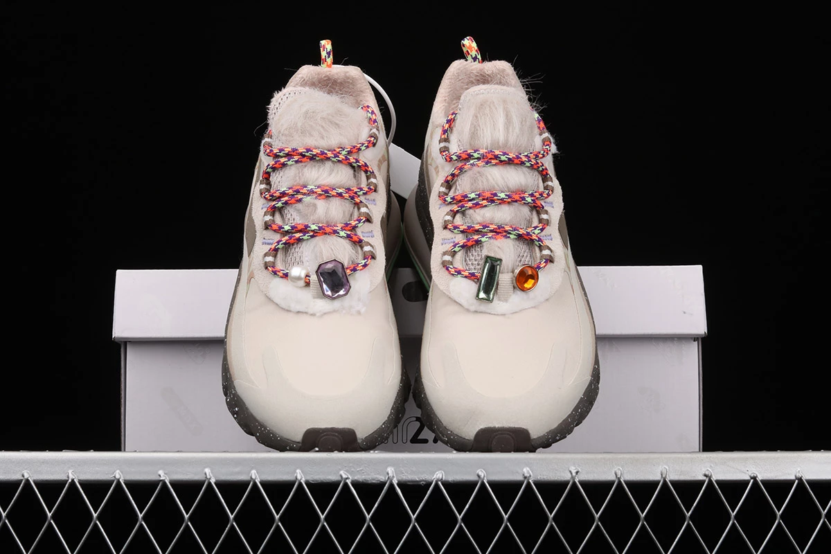 The most outstanding of the offering’s features would undoubtedly be the attached fur that outfits a large section of the instep. Its hairs are wrapped over top by colorful rope laces whose topmost loop is accessorized with a green carabiner and a complementing paracord keychain. What’s more, the vamp brings along the brand’s penchant for jewelry as gems of emerald, orange, and purple shades are used as if dubraes. A light tan then lies underneath in two fashions: one a more flat, unblemished finish and the other an eccentric mosaic of animal print. Speckled soles then draw just below, volt accents the model’s matted Air unit, and terry cloth warms from within.